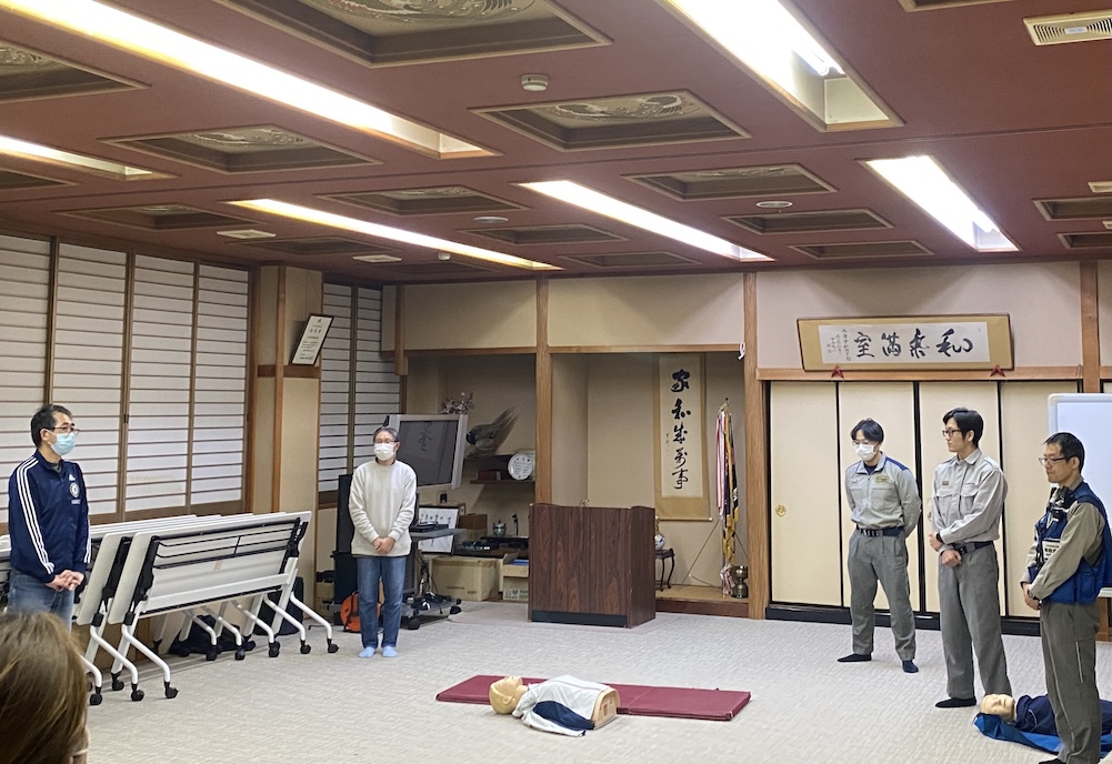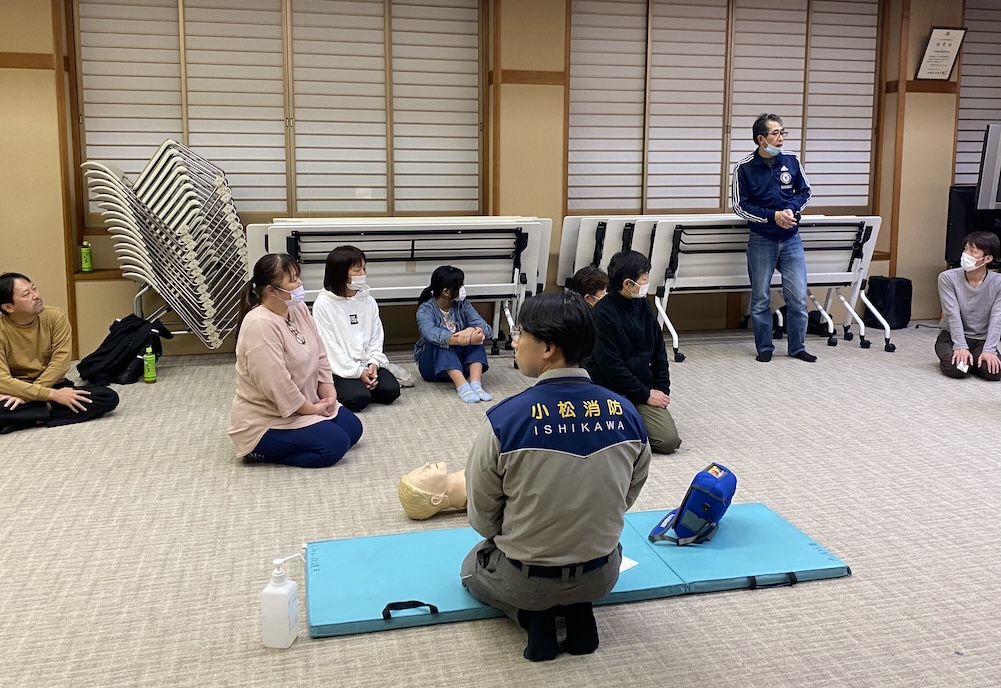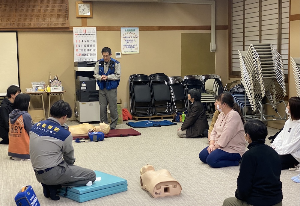 • 駅前会館にて。心肺蘇生法とAEDについて訓練用の人形やAEDを使って、